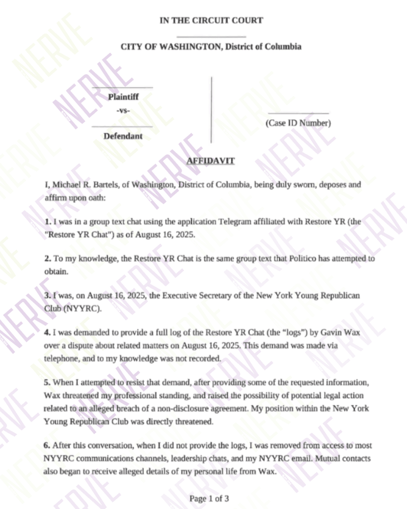 Bartels states that when he resisted Wax’s demand for the full chat logs, after providing some requested information, Wax “threatened my professional standing, and raised the possibility of potential legal action related to an alleged breach of a non-disclosure agreement.” The affidavit continues: “My position within the New York Young Republican Club was directly threatened.”