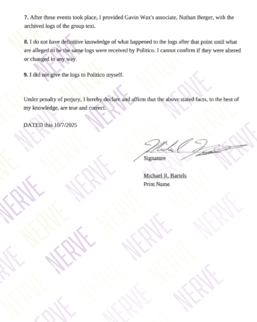 The affidavit reveals that Bartels later provided archived logs of the group text to Nathan Berger, identified as Wax’s associate. However, Bartels explicitly states: “I do not have definitive knowledge of what happened to the logs after that point until what are alleged to be the same logs were received by Politico. I cannot confirm if they were altered or changed in any way.”