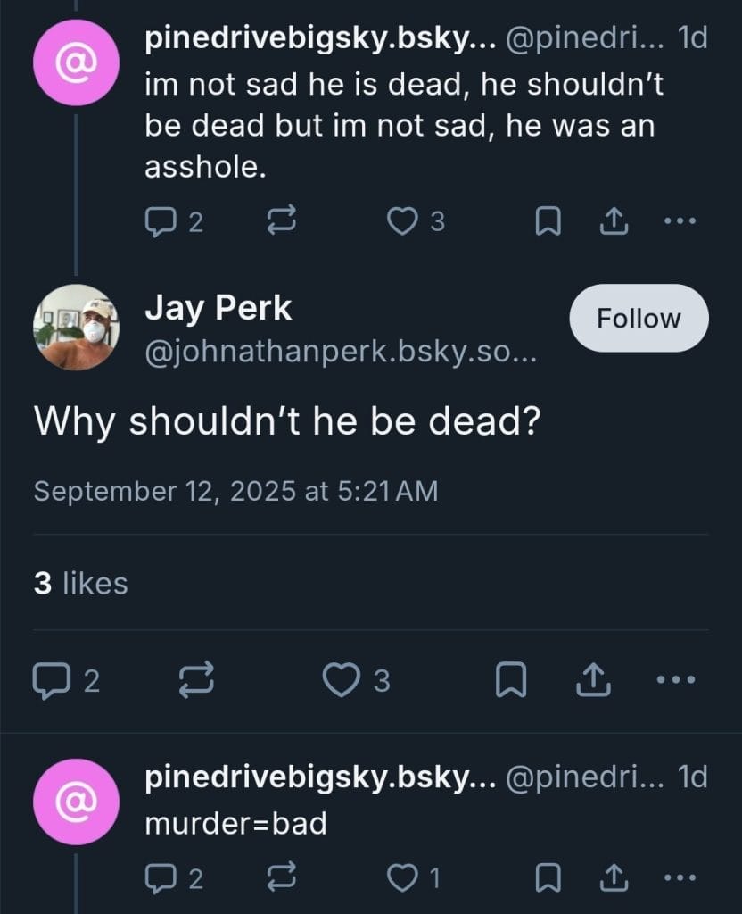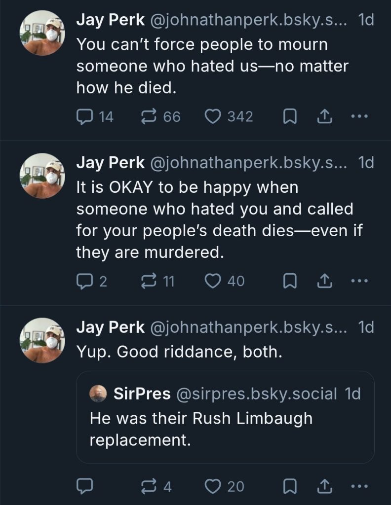 “It is OKAY to be happy when someone who hated you and called for your people’s death dies—even if they are murdered,” he wrote on his now locked Bluesky account.