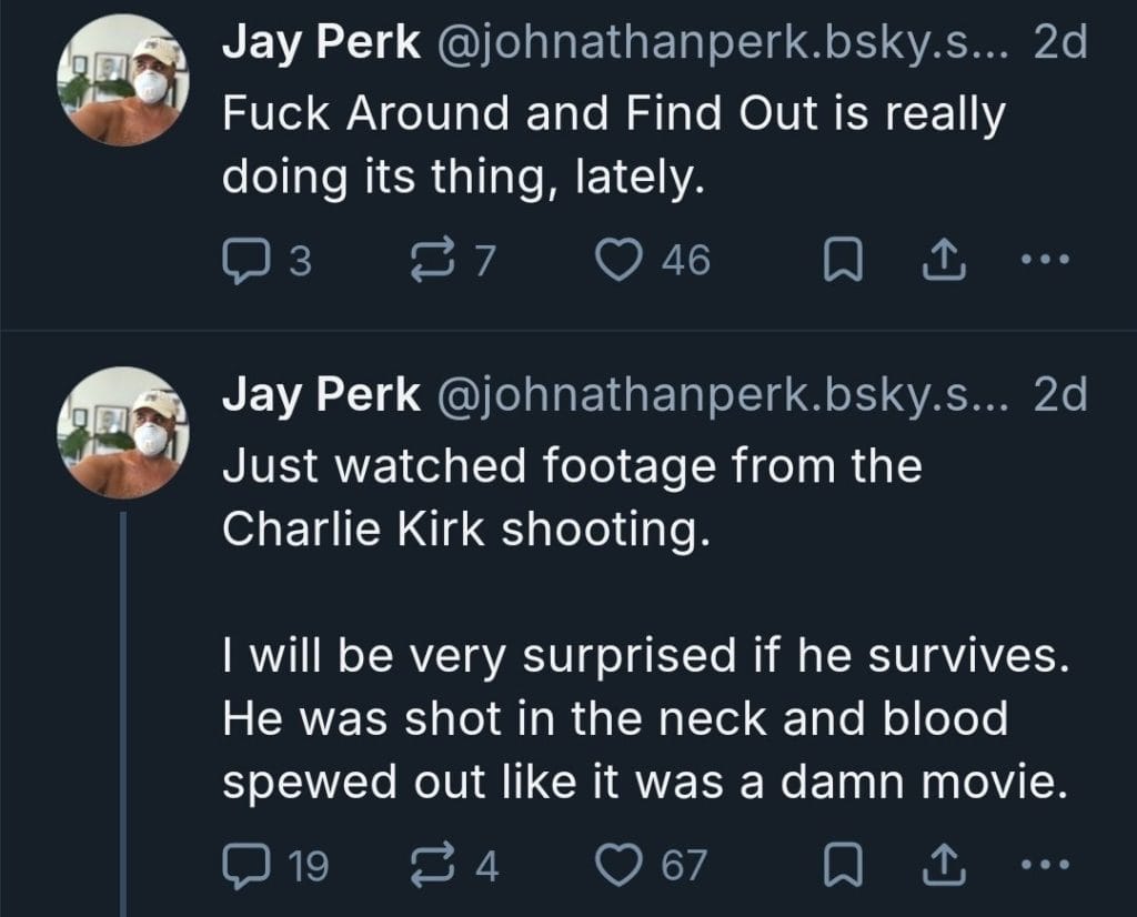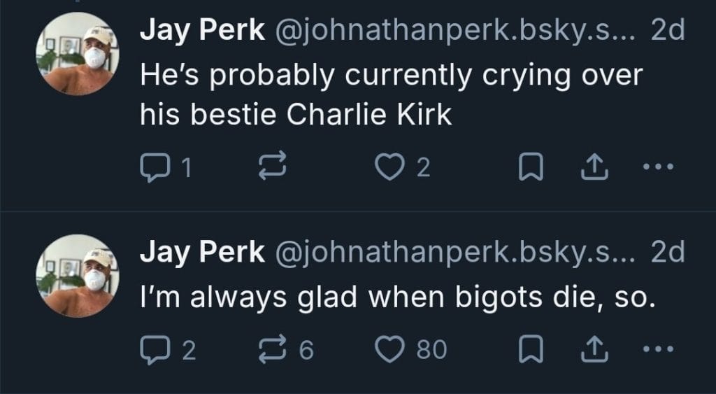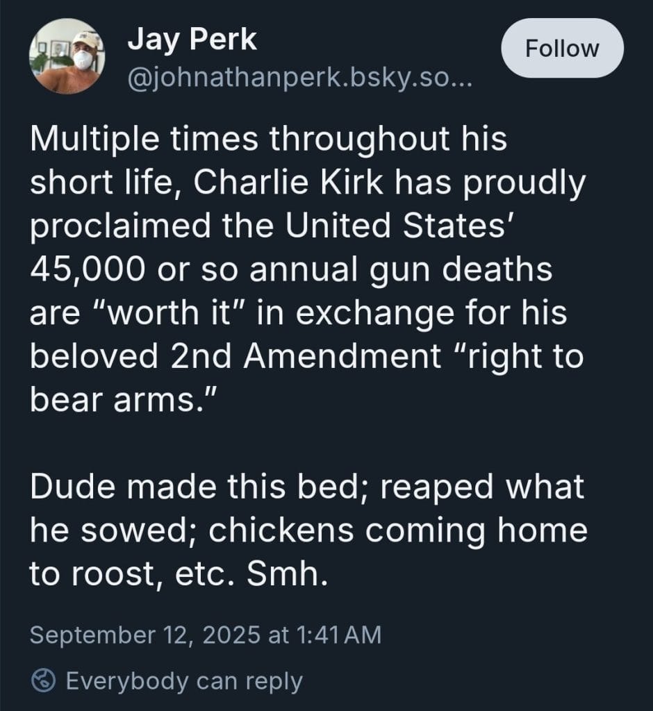 “Multiple times throughout his short life, Charlie Kirk has proudly proclaimed the United States’ 45,000 or so annual gun deaths are ‘worth it’ in exchange for his beloved 2nd Amendment ‘right to bear arms.’ Dude made this bed; reaped what he sowed; chickens coming home to roost,” Perkins wrote in another post, further elaborating on his lack of sympathy.